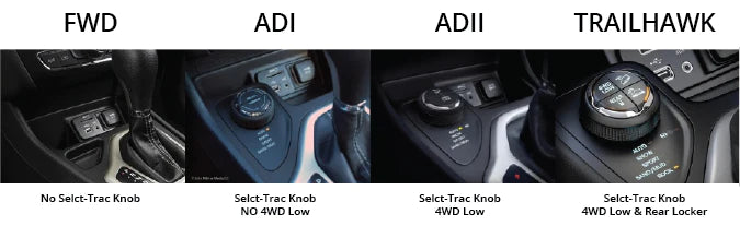 There are 4 drive-lines for the 2014+ Jeep Cherokee. FWD (Front Wheel Drive), ADI (Active Drive I), ADII (Active Drive II) & Trailhawk. If you are unsure in which drive-line you have on your Cherokee, you can use the image below as a quick way to figure it out.